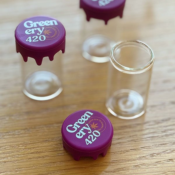 Pequeno frasco de vidro com tampa de silicone da Greenery420, projetado para preservar com segurança e elegância seus extratos ou flores.