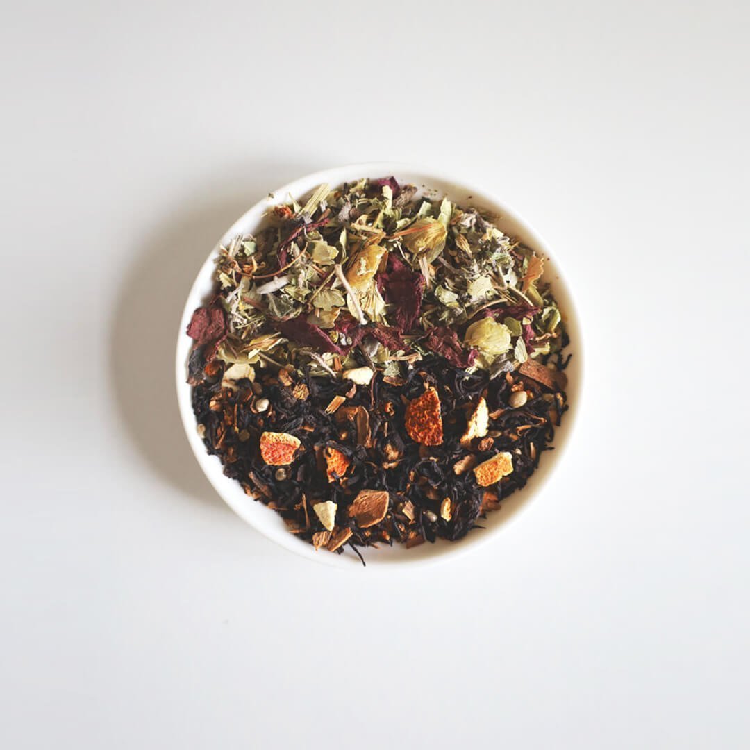 Tília, valeriana, sálvia, verbena de limão, lúpulo, sementes de cânhamo, pétalas de erva-cidreira e capim-limão.